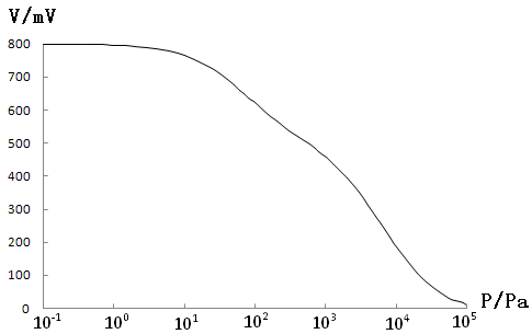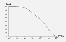 在测量过程中,振荡电路电压UAC保持恒定,约100mV,Z0在温度不变时为常数,R为固定电阻,可见Z-Z0单值地决定于UBC,气体压强也单值地决定于UBC。在P=0时,将晶振调至谐振,即调振荡电路的频率,使UBC调至最大值(因为晶振谐振为串联谐振)。在此条件下UBC,与气体压强是单值关系。UBC,经放大,检波后由电压测量电路输出,输出电压读数V与压强P的关系曲线如图3所示