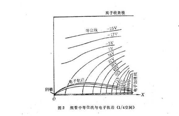 e——电子电荷(库伦),m——电子质量(千克), 阴极绝对温度,取1500K。发射方向与OX轴(通过阴极中心的一个对称轴,见图2)的夹角为0,α,2α三个不同的角度。α=π/5。由图可见,电子的轨迹仅局限于OX轴附近很窄 的区间。放电空间的电位分布(见图2等位线)对电子有会聚作用,从电子轨迹也看出这一点,因而电子不会分散。