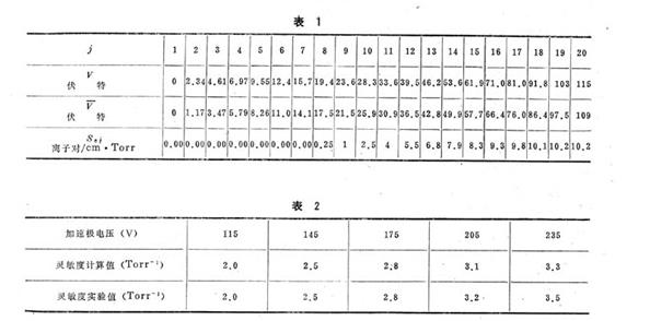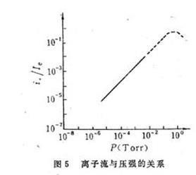 由表1中所列 看来,离子主要产生在电子加速极附近。在阴极附近,几乎占整个路程一半的范围,产生的离子是很少的。本文计算的误差,一方面由于按(4)式计算引起,因为在DL-5中,电子束也还是有较小的分散;另一方面由电离效率的误差所引起。电离效率的测量值以依赖于气体压强的测量 。电离效率一般在 气体压强下测量,用麦克劳真空计在这范围的测量误差大约为±3%-±5%。测量离子流与电子流放大器的高阻误差大约为±5%,用水银温度计接触在玻壳上测量误差大约为±0.5%。电子路程的误差大约为±0.3%.电压的测量可以准确到±0.08伏特。因而电离效率的测量 误差可做到±7—±10%。但是现在的测量值各文献还相差很大。文献 [3]中各种气体的数值经常被人引为比较的标准。最近,氮气的测量值在高能量时要低些[4],例如在100V,[4]中 值比[3]中 值 低 13%,见图4中曲线2.如果按[4]中电离效率计算DL-5规 管 的 灵敏度为 。关于电离效率的理论研究目前更为少见。在高压强,实验测得离子流与压强的关系如图5虚线所示。由图可 见,离子流随压强的上升达到最大值,然后下降。从理论上精确计算这曲线还有待于进一步的研究。在最大值左侧局部范围, 离子流与压强,近似的表现为线性关系,这部分也可用来测量压强,它与高真空的线性区连在一起,可以形成很宽的线性区。DL-5规 管就是这种情况,在离子流与压强偏离线性10%时 的压强值为 ,因而线性范围为 。