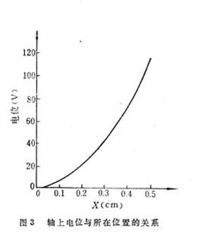 在电离过程,计算电子产生的离子总数可以认为是在OX轴上不同点产生的离子数的总和。 也就说把整个电子束看成路径都相同的一束。同时由于收集极面积很大,可以认为所产生的离子都被收集,即C=1,因而灵敏度可按(4)计算,这就是计算灵敏度变得很容易。在OX轴不同 位置的电离效率 单位值决定于X坐标(阴极中心为原点)。 在规管工作电压下,由电子计算机计算不同x处的电位列于表1中,其曲线如图3所示。由图可见,在阴极附近,电位上升缓慢 , 电位与x坐标的关系可近似的表示为 。